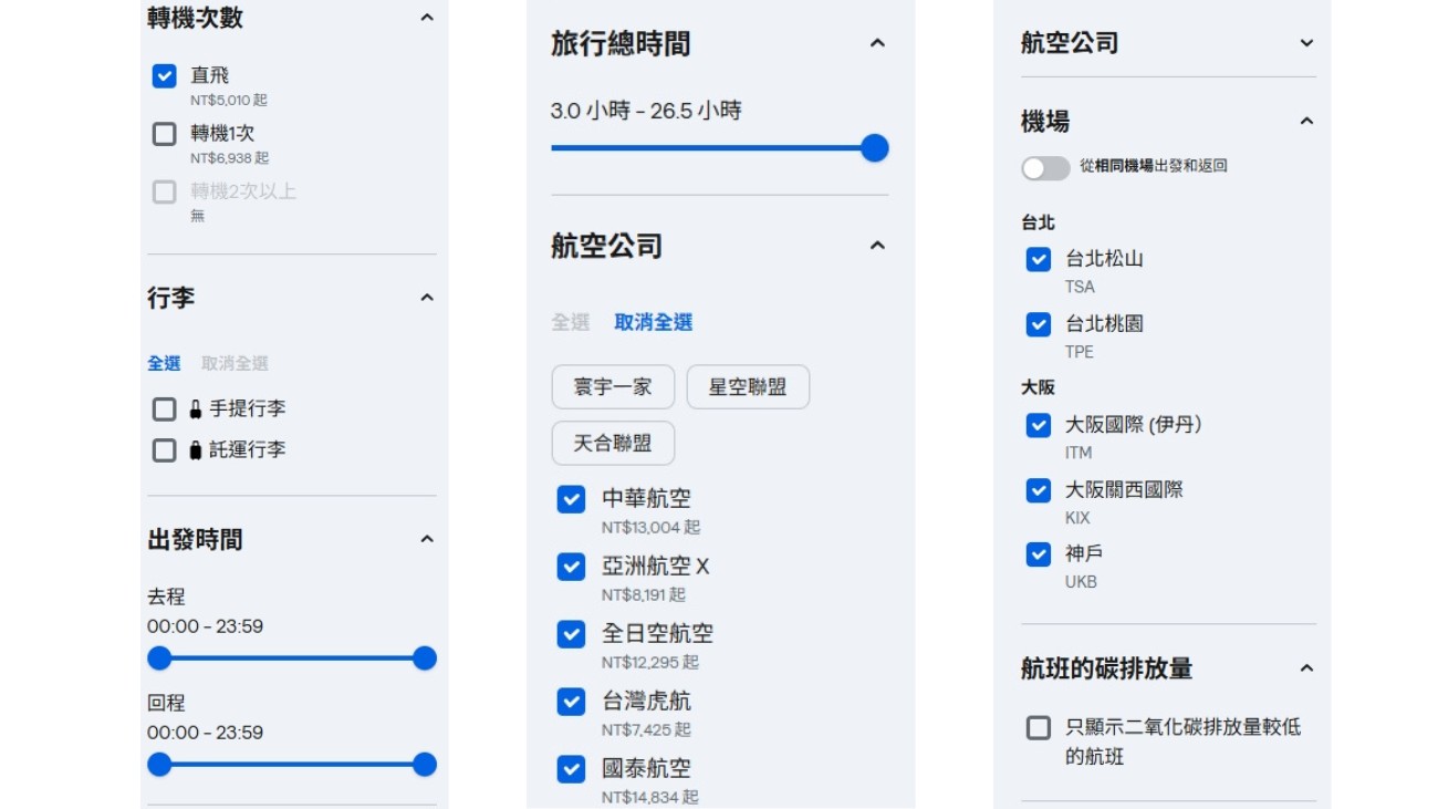 像 Skyscanner、Google Flights 等比價平臺,都可以設定「價格通知」,當票價出現波動時就會自動提醒。 這樣不必每天手動查票,也能在價格下修時第一時間掌握機會。有時從臺中、高雄出發,反而會不定期出現超值票價。若行程允許,彈性選擇出發地,買到便宜機票的機率也會大幅提升。